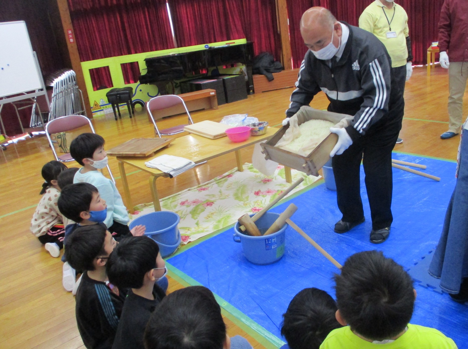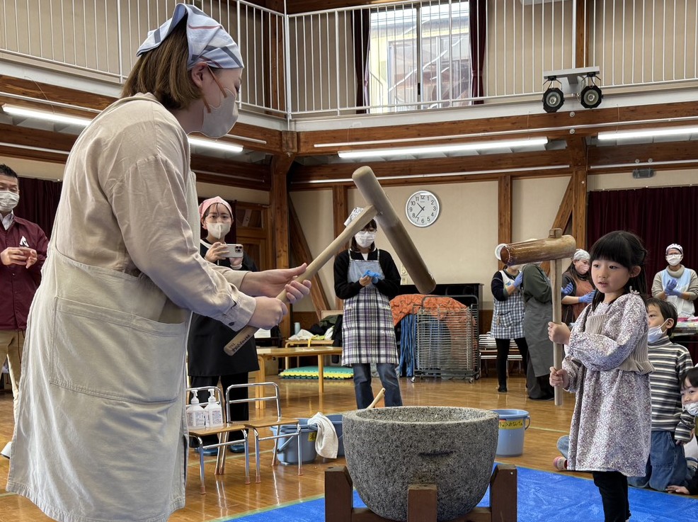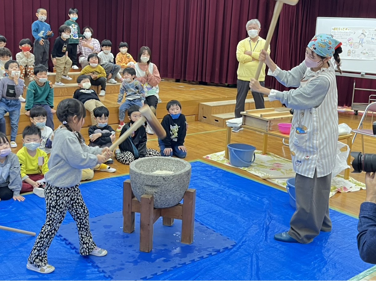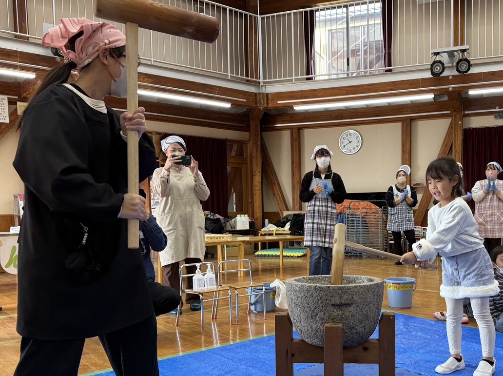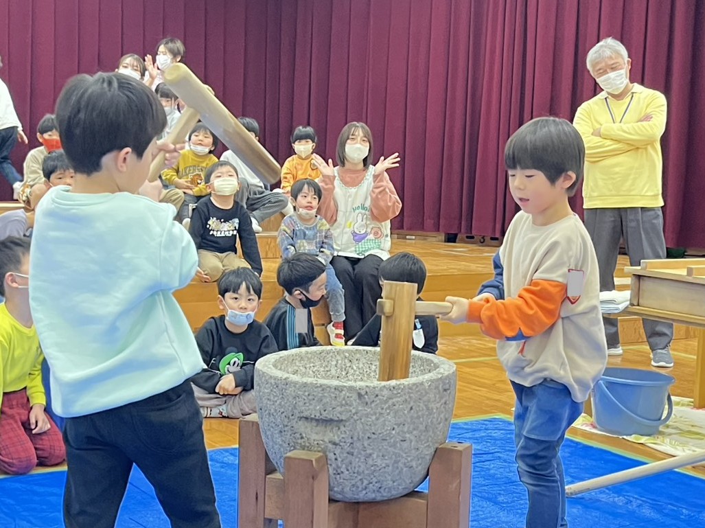 次は年長さんが杵で餅をつきます💪🏻